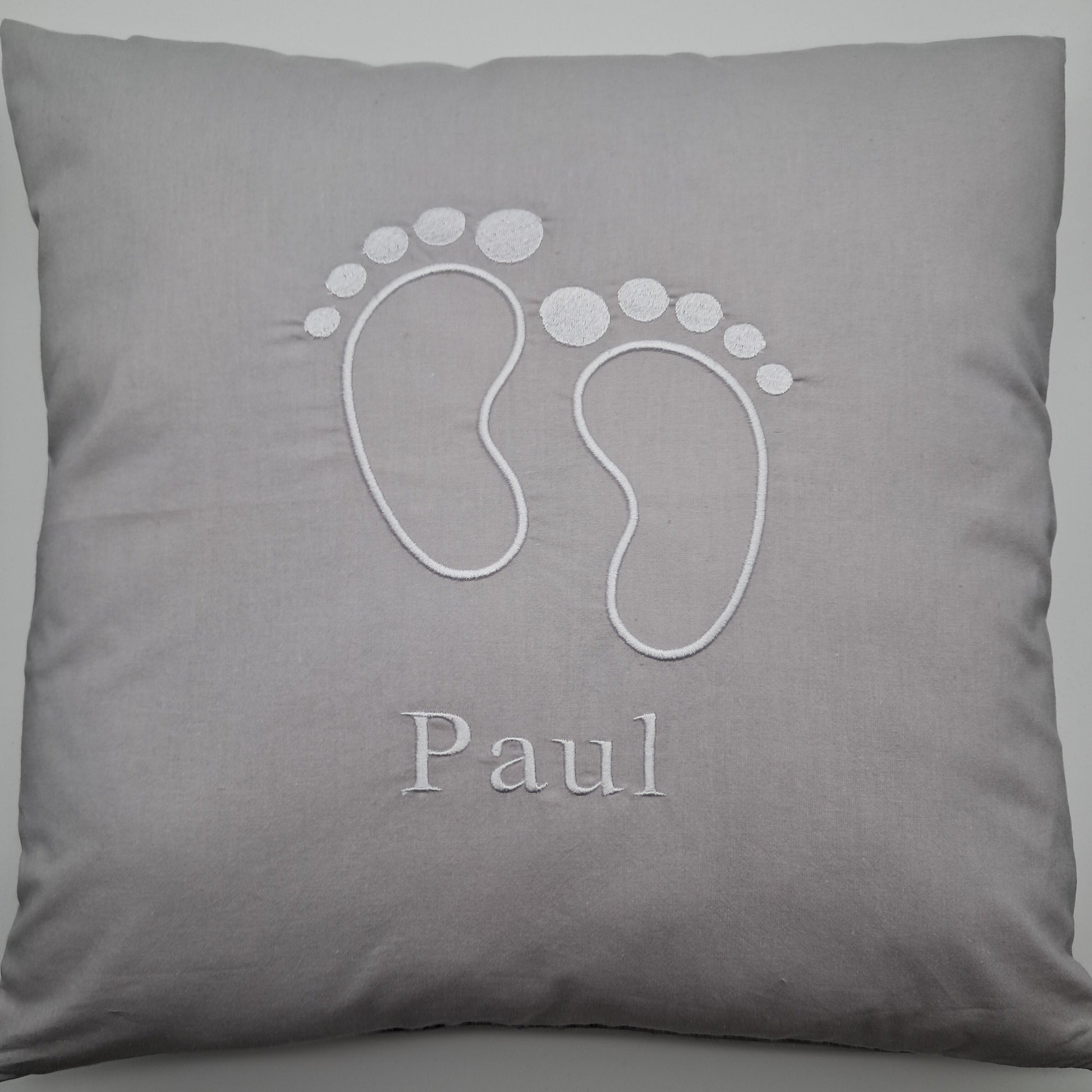 Dieser liebevoll bestickte Kissenbezug mit zarten Babyfüßen hält genau diesen besonderen Augenblich für immer fest.